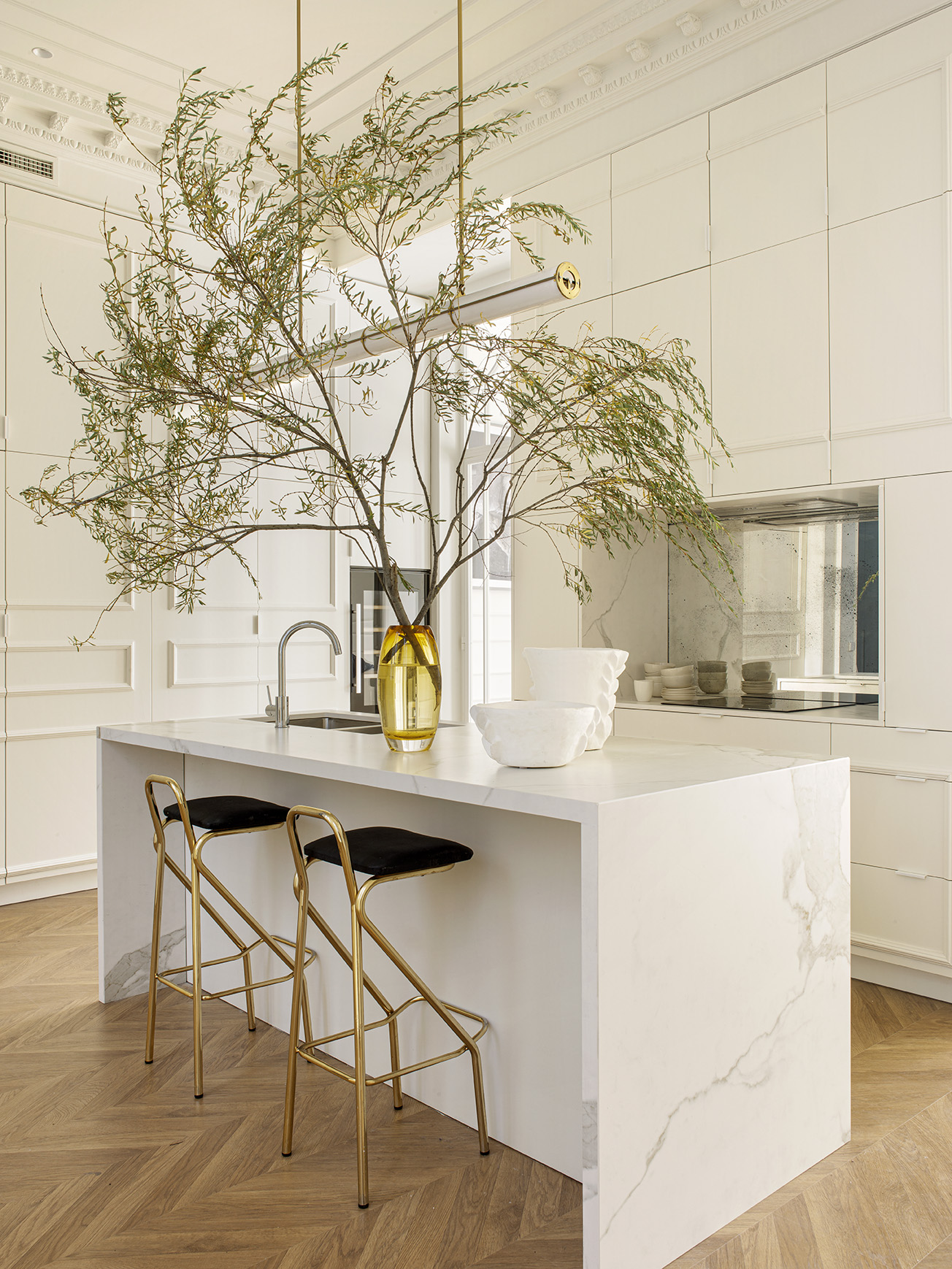 Se proyectó una casa en las que se diseñaron y añadieron las molduras desde cero para crear un telón de fondo que parezca estar desde el principio. La moldura actúa como protagonista. Potencia los techos altos originales y sirve de hilo conductor para la estética global de la casa. Este elemento integra tanto las puertas como los armarios de la cocina, cosa que también ocurre en las habitaciones donde los armarios se esconden en las paredes. Por otro lado, las cristaleras de hierro de inspiración modernista de casi 4 metros de alto, se diseñaron para conectar visualmente las estancias principales para dar un aire moderno a la casa sin perder el carácter monumental que posee el edificio.